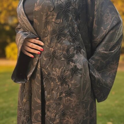 صُممت خصيصاً للمرأة التي تبحث عن الفخامة والراحة في آن واحد. تتميز بقماش الكريب الأسود الفاخر وتفاصيل مشغولة يدوياً تضفي سحراً خاصاً على إطلالتك.