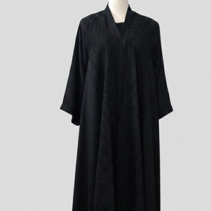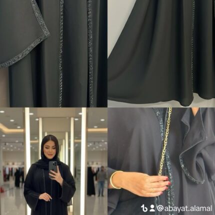 عباية راقية تتميز بشريط تطريز خرز رفيع ممتد على طول العباية من الأمام وعلى أطراف الأكمام ليعطي لمسة من الفخامة الهادئة.