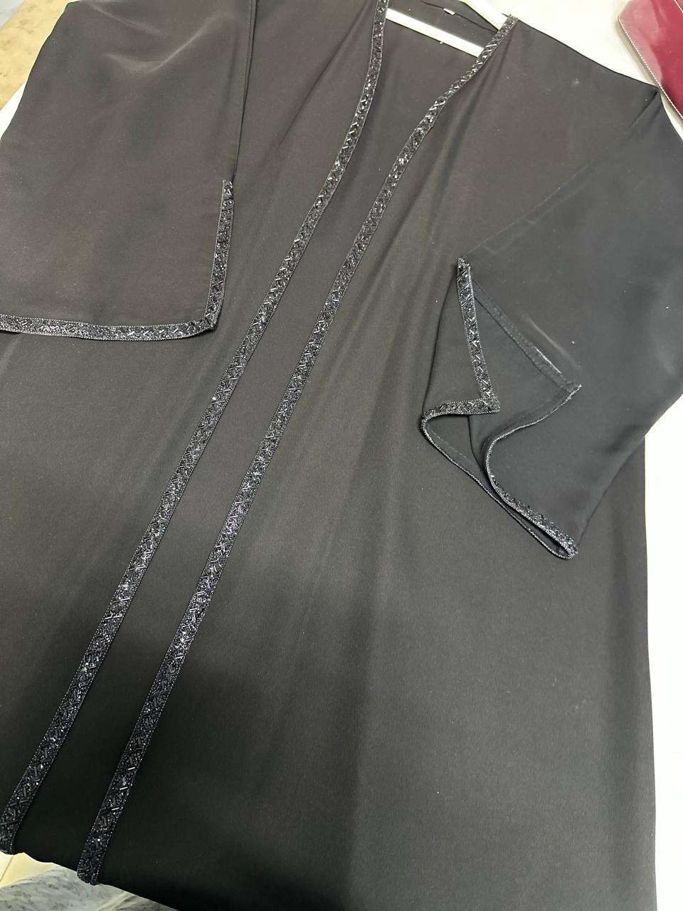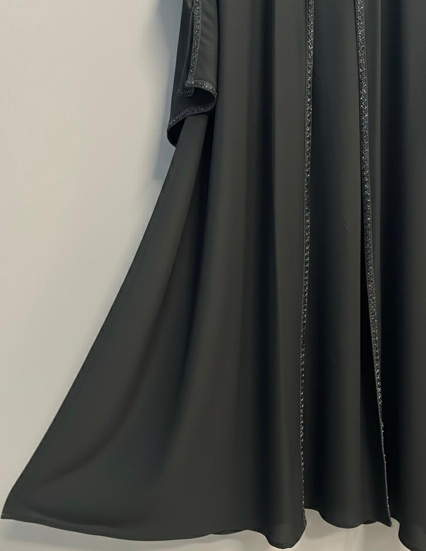 عباية راقية تتميز بشريط تطريز كريستال (أو خرز) رفيع ممتد على طول العباية من الأمام وعلى أطراف الأكمام ليعطي لمسة من الفخامة الهادئة.