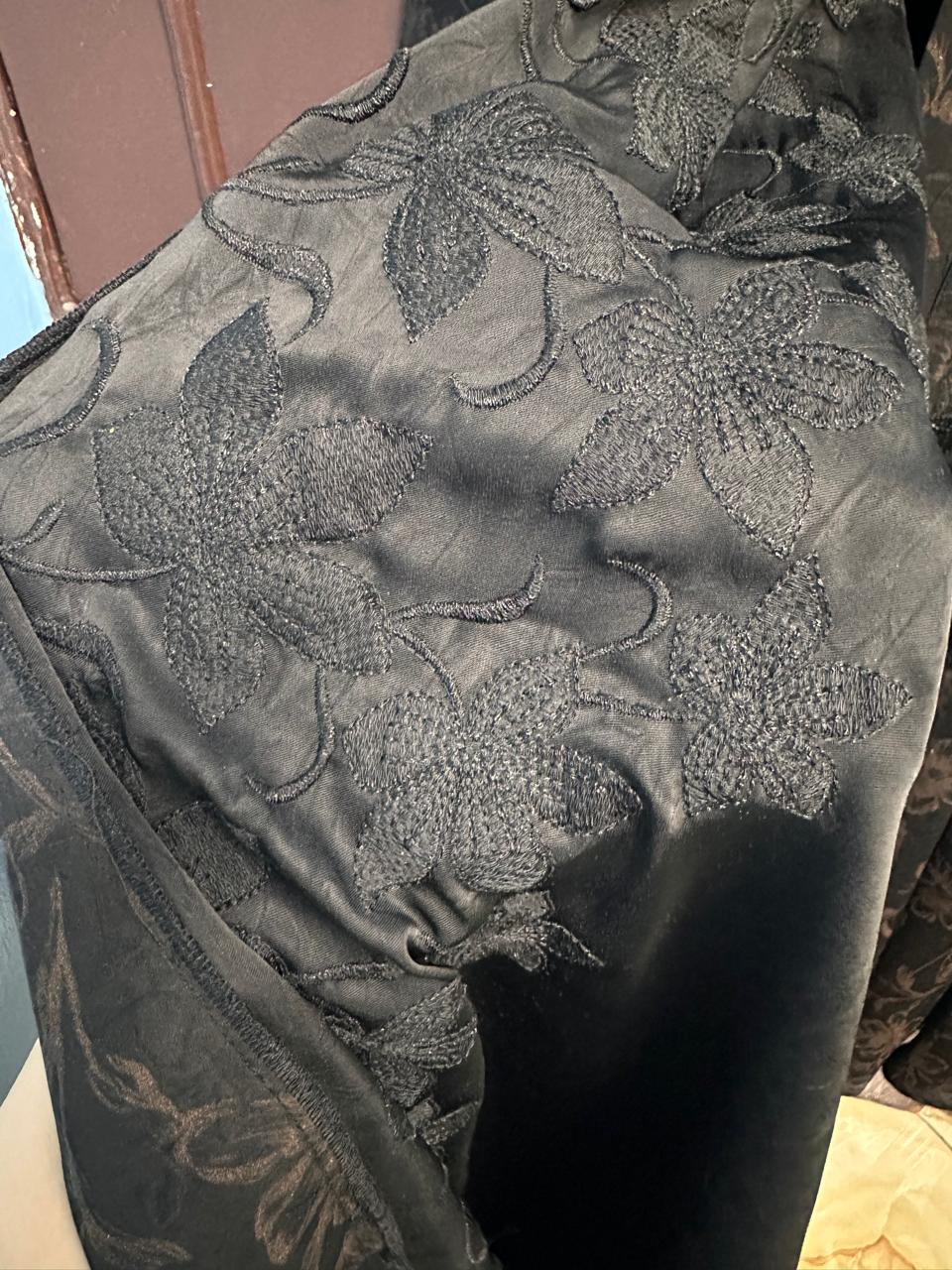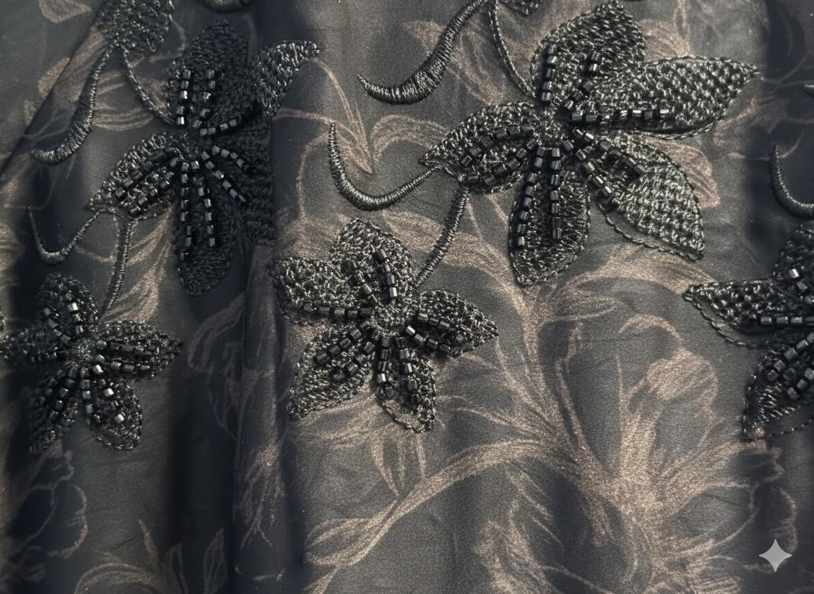 * التطريز: تزدان العباية بتطريز يدوي بارز (3D) من الخرز والكريستال الأسود اللامع، تم توزيعه بعناية على الأكمام والجزء الأمامي ليعطي لمسة من الفخامة اليدوية.