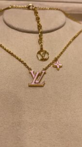 قلادة لويس فيتون (Louis Vuitton) ذهبية مرصعة بالمينا الوردي – تصميم أيقوني ناعم